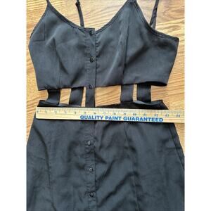 This stunning Pins and Needles maxi dress is perfect for any occasion, whether you're headed to a festival, a party, or just running errands. The dress features a V-neckline and adjustable spaghetti straps, with a button front closure and a cut-out design. The caged middle torso adds a touch of elegance, while the lined polyester fabric ensures comfort and durability. No size tag see pics for measurements