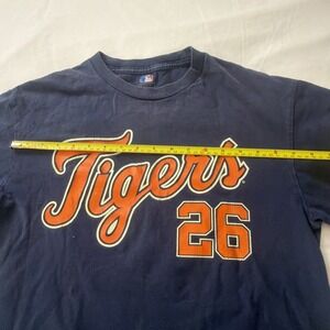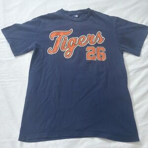 Ai- The product is a men's size medium Detroit Tigers MLB Majestic jersey shirt. This officially licensed baseball apparel features the Detroit Tigers team logo and colors, making it a perfect fan item for supporters of the team. Made by a reputable brand like Majestic, this gym shirt is designed for both comfort and style, making it a great addition to any baseball fan's wardrobe.