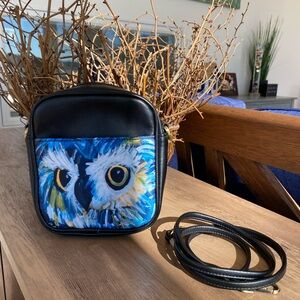 Two credit card slots, Zip-top closure with fabric lining. Attached wrist strap.