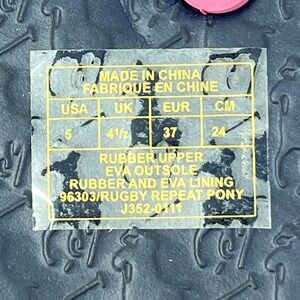 This product is a vintage pair of Polo Ralph Lauren unisex junior flip flop sandals in pink with an ivory pony logo. The sandals are US size 5, EU size 37, and UK shoe size 4.5. They feature a flat heel, animal print pattern, and are made with a rubber upper material and EVA outsole. Perfect for summer, fall, and spring seasons, these stylish sandals are a must-have for any young fashion enthusiast looking to add a touch of classic luxury to their wardrobe.