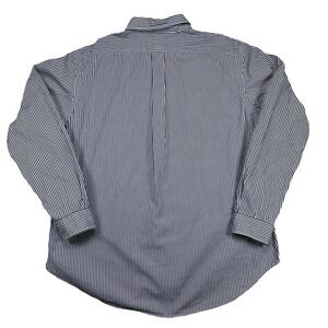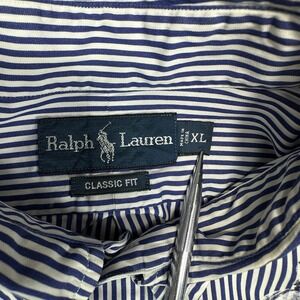 Polo Ralph Lauren men's Classic Fit button-down shirt in size XL. Features a navy and white narrow stripe pattern with a bold graphic logo print across the front. Long sleeves with button cuffs and a button-down collar. Relaxed classic fit offers comfortable wear and versatile styling, from casual to statement streetwear looks.