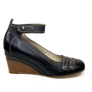 Gorgeous black leather size 40 wedge Fly Girls. Fit like a size 9. Standard width. Velcro ankle wrap. Three inch wedge heel. Very good condition.