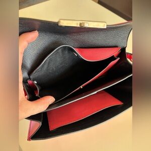 The removable strap design allows it to be styled as a shoulder bag or crossbody (crossbody strap not included). The interior is lined in black leather, with a partitioned layout and patch pocket, ideal for carrying your daily or evening essentials in sleek Prada style.