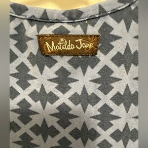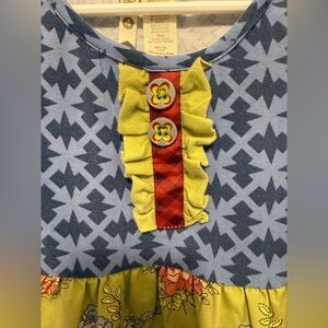 Sleeveless tiered dress with a mix of floral patterns on the skirt and a blue geometric pattern on top. 2 decorative buttons on chest. Normal wear but still in very good used condition.