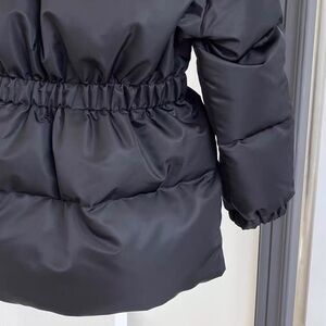 Elegant Prada puffer with a hood. Features front pocket and button closure. Ideal for winter wear.