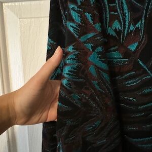 Mara Hoffman green blue and chocolate brown palm leaf print swing mini dress with pockets. Beautiful chocolate brown knit fabric with almost metallic teal floral pattern. High turtleneck collar. Zip back closure. Size small. Excellent used condition.