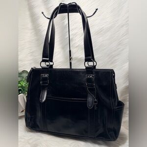 Sleek black leather design. Perfect for work or travel. Durable and stylish.