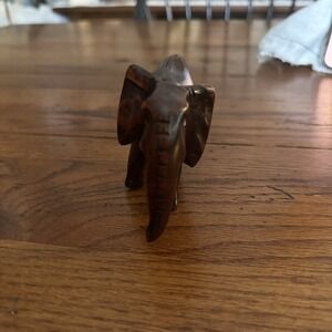 This vintage wooden elephant figurine is a charming collectible piece, hand carved from wood. With intricate details and a miniature size, this unique figurine captures the essence of a majestic elephant in a compact and beautifully crafted form. Perfect for collectors or as a special display piece in any home or office setting, this handcrafted item adds a touch of nature and artistry to any space.