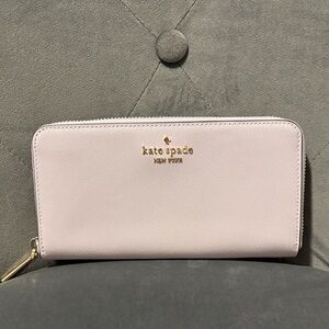 Chic Kate Spade wallet in lavender. Features elegant gold accents. Perfect for daily essentials.