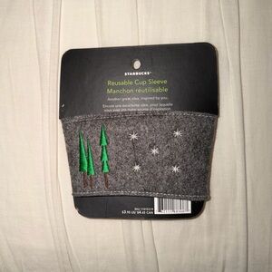 Gray felt sleeve featuring green embroidered trees and white star accents. Includes Starbucks branding.
