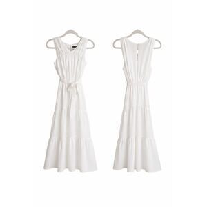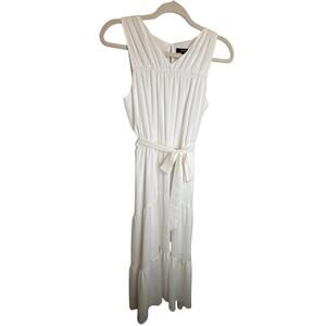 Classic and feminine Simply Vera Vera Wang white midi dress featuring a sleeveless design, softly pleated bodice, elastic waist with adjustable tie, and a flowy tiered skirt. Fully lined for coverage and comfort. Lightweight fabric with slight stretch, making it perfect for spring and summer wear, brunch, vacations, bridal showers, or casual events.