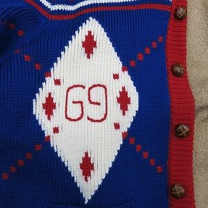 Gucci Blue Argyle Intarsia GG Heavy Wool Cardigan Sweater Size L