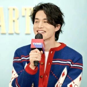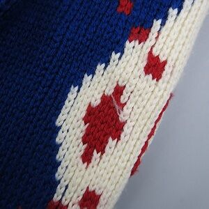 Long sleeve knit wool cardigan in blue featuring stripes and argyle pattern in off-white and red.