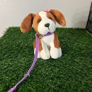 Adorable plush dog featuring a purple collar and leash. Soft and cuddly.