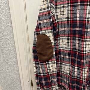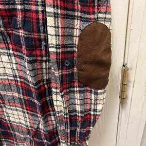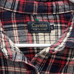 Cavalini Women's Plaid Red Black White Shirt, Size Small — Perfect for casual wear. This stylish button-up features a classic plaid pattern in red, black, and white, making it a versatile addition to any wardrobe. The shirt is designed with unique brown elbow patches and convenient roll-tab sleeves, allowing you to adjust the sleeve length for different looks or temperatures. Ideal for layering or as a standalone piece. Excellent pre-owned condition with no stains or holes.