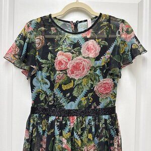 This floral print chiffon midi dress has a high round neckline, semi-sheer flutter sleeves, and a pleated midi-length skirt. A black hand-beaded belt accents the natural waist.