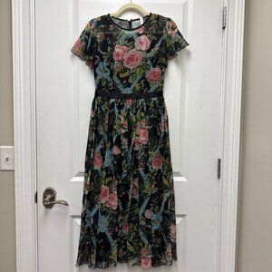 Cocktail, wedding guest, semi formal, special occasion, dinner party, evening, floral, beaded, flowy, Feminine, romantic, fairy, designer, mother of the bride groom, rehearsal dinner, wedding shower, garden party