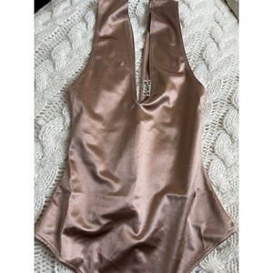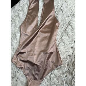 NEW WITHOUT TAG FREE PEOPLE Sz XS KEEP IT SLEEK DUO METALLIC PLUNGE BODYSUIT LATTE CASINO.