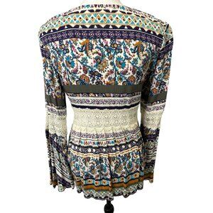 A bohemian-inspired top with a peasant style, featuring bell sleeves and a scoop neck. The pattern and color scheme add a touch of cottage core charm.