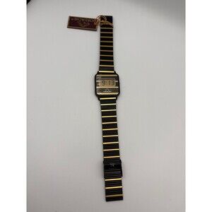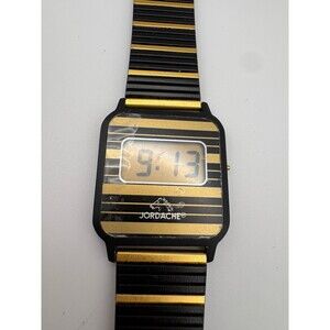 The iconic black and gold pinstripe design perfectly captures the 1980s designer aesthetic. It features a crisp LCD display and the classic Jordache horse logo. To ensure it's ready to wear or display, a fresh 397/SR726SW silver oxide battery has been professionally installed, and the watch is in full working order.