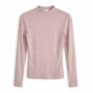 Reformation Bailey Knit Top in a soft rose sparkle pink with a subtle metallic shimmer that catches the light beautifully. This fitted knit top features a sleek mock neckline and long sleeves, creating a flattering, streamlined silhouette that’s perfect for day-to-night styling. The lightweight, stretchy fabric hugs just right without feeling restrictive, making it ideal for layering or wearing on its own.