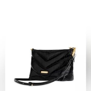 This is a black quilted leather Rebecca Minkoff Edie Crossbody bag with a charm chain strap