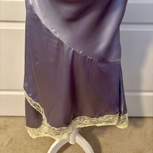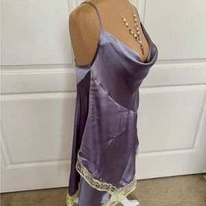 Turn heads in this gorgeous Nasty Gal Lilac Satin Mini Dress, a romantic blend of vintage charm and modern style. This figure-skimming slip dress features a draped cowl neckline, adjustable spaghetti straps, and delicate contrast lace trim along the hem and sides. The open back with crisscross straps adds a flirty touch.