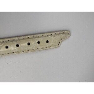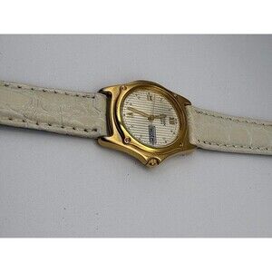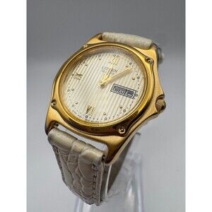 This stunning vintage Citizen women's watch (Model 6000-R43098-Y) features a sophisticated gold-tone finish and a unique pinstripe-textured champagne dial. The face is elegantly detailed with a mix of Roman numerals at the primary hours and gold dot indices, complemented by a functional day-date window at the three o'clock position. Powered by a reliable Japan quartz movement, the watch is built for daily durability. A brand new battery has been fitted recently to ensure perfect timekeeping. It comes with a brand new white crocodile-embossed genuine leather strap that offers a fresh, luxury look. A standout feature is the unique gold-tone horseshoe buckle and the distinctive tapered leather band tip, which add a bespoke feel to this classic timepiece. The case shows gentle vintage wear that highlights its authentic retro appeal