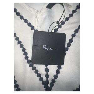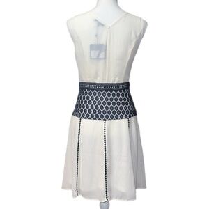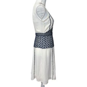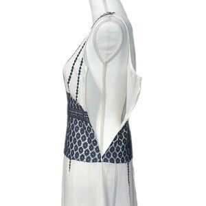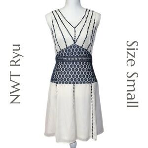 Embrace effortless style with this Ryu dress in size small. The sleeveless design features a flattering V-neck and intricate blue geometric patterns on a crisp white background. Perfect for warm weather outings, this dress offers a fresh and modern look with a touch of elegance. Side Zipper for easy on/off.
