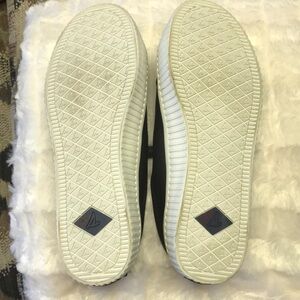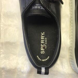 Sperry black leather sneakers with durable white soles. Perfect for everyday wear. Sz 9. Preowned with little signs of wear.