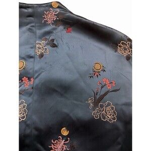 Features a traditional frog closure, floral embroidered pattern, and a silky satin-like finish.