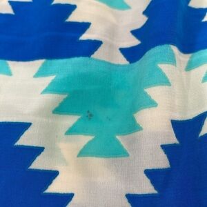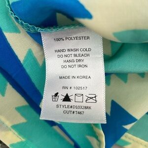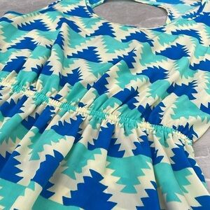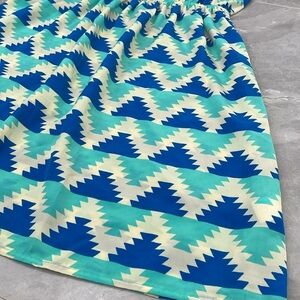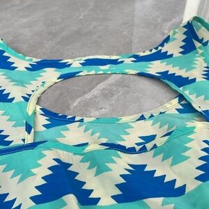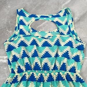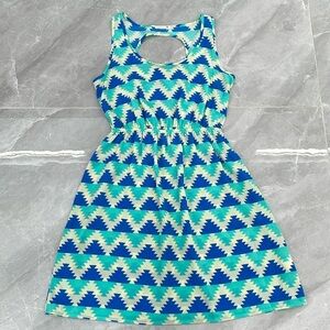 Good condition - Women's Francesca’s Soprano Sleeveless Dress. Has an elastic waist and half circle cutout in the back. Tiny stain on back toward bottom, as pictured. Colors: cream, blue, and mint. Size: M.
