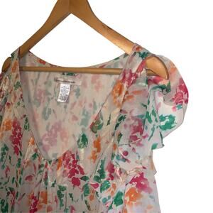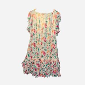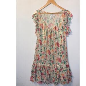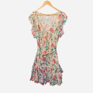 Stunning flutter mini dress in shimmery floral print from Diane Von Furstenburg. Features colorful “rainbow garden” print over gold shimmery base, open neck with feminine fluttery sleeves,tiered skirt with pleated ruffles, and light fabric lined interior.