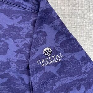 Straight Down men's quarter-zip golf pullover in a purple and dark blue tonal camo pattern. Made from lightweight polyester performance fabric with stretch for comfort, mock neck collar, and Crystal Mountain embroidered sleeve logo. Designed for golf, resort wear, and everyday athleisure use. Good pre-owned condition, see images for details.