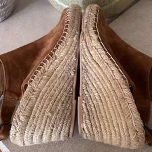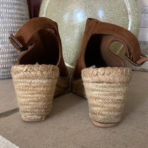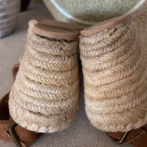 GAP Faux Suede Strap Espadrille Wedge Mules Open Toe. Rich caramel brown colored faux suede. Espadrille style heel and sole. Back ankle adjustable straps. Great condition. There is a small space at bottom of sole and heel but has not pulled apart, it just looks as such. The espadrille part have a few spots that can use a cleaning. Faux sued in great condition! Size 8.