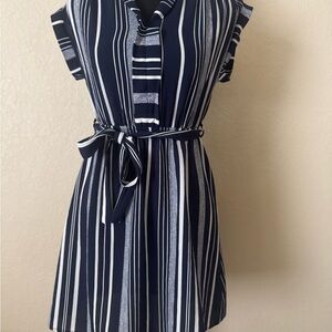 Stylish mini dress with bold stripes. Features a tie waist for a flattering fit.