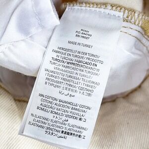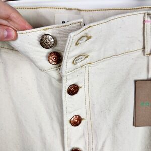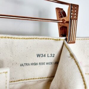 *Features: Ultra high-rise waist, wide leg cut, structured denim fabric, button fly closure, five-pocket design.Cream color, Cotton blend.