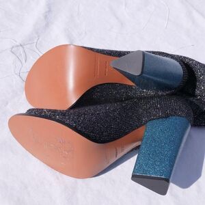 These are so beautifully made with a sturdy leather peep toe heel inside the stretchy sock material, blue sparkle heel, padded insole, made in Italy