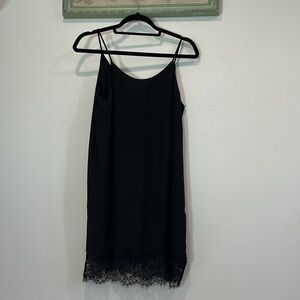 Elegant black slip dress featuring a delicate lace hem. Perfect for a night out with the girls, gays, theys, or your husband/baby daddy!