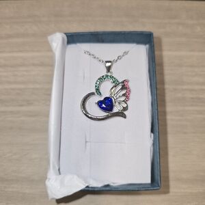 Charming butterfly and heart pendant necklace featuring striking blue and pink accents. A perfect accessory to enhance your style. Brand new in box!