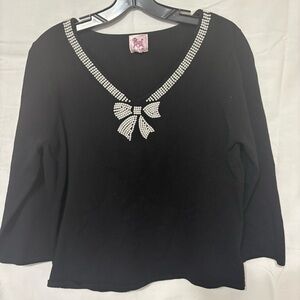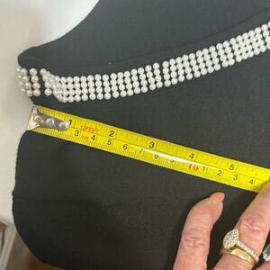 Embellishment: Pearl trim along the neckline and a prominent pearl bow accent at the center of the V.