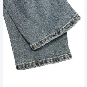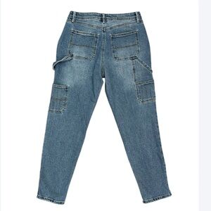 Sincerely Jules carpenter-style mom jeans in a classic blue wash. Mid-rise with a relaxed tapered leg and utility-inspired pocket details on the back and side. Soft denim with light fading gives it a worn-in 90s look.