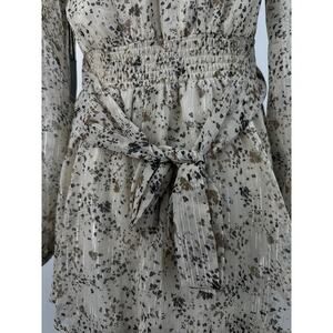 Elevate your wardrobe with this beautiful New with tags Japna long sleeve ruffle tiered mini dress in a soft beige floral print with metallic accents. This gorgeous dress features a feminine V-neckline, flowy layered skirt, and cinched elastic waist with a matching tie belt for a flattering silhouette. The lightweight, lined chiffon-style fabric adds movement, making it perfect for events, parties, brunch, date nights, or special occasions.