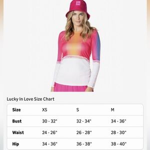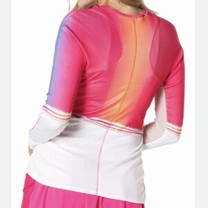 A perfect balance of dainty and sporty share the court or course in this crisp long sleeve. Lucky In Love lightweight performance rib gets a little fashion flair with slight gathering along the waist. Excellent condition, like new (care tag removed-wash cold). Perfect balance of dainty and sporty with fashion flair. Pink and orange ombré tones. Narrow shoulders and slight gathering along the waist for a more feminine look. Fitted with racer back style. Lightweight and mesh detail under sleeves. 92% Polyester/8% Lycra. Gift(s) included with purchase. Should you have any questions, please do not hesitate to ask. Thank you for visiting my closet. 💐
