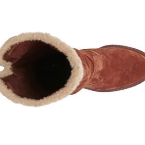 The Gambrel over-the-knee boot by Vince Camuto elevates your fashion standards to the next level. This tall boot features contrasting fur-like trims on the topline and rear shaft for an interesting look and is well-supported with a wood-like stacked block heel that adds an enhanced appeal to the overall profile.