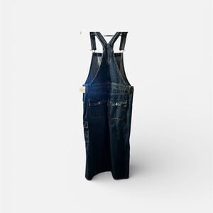 Stylish dark blue denim overalls dress. Features adjustable straps and front pockets. NWT.