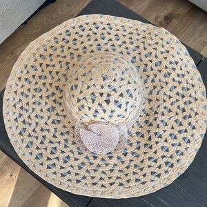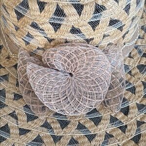 Charming sun hat in tan with a delightful flower accent. Perfect for sunny days.