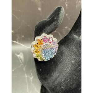 Vintage 925 Sterling Silver Flower Drusy Multi Gemstones Cocktail Ring Size 8