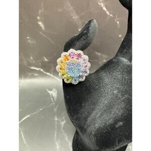 The ring features a beautiful flower design adorned with a mesmerizing drusy stone and accented by a variety of colorful gemstones.