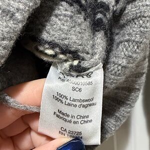 Cozy zip-up with reindeer pattern. Charcoal and black design. Perfect for chilly days.